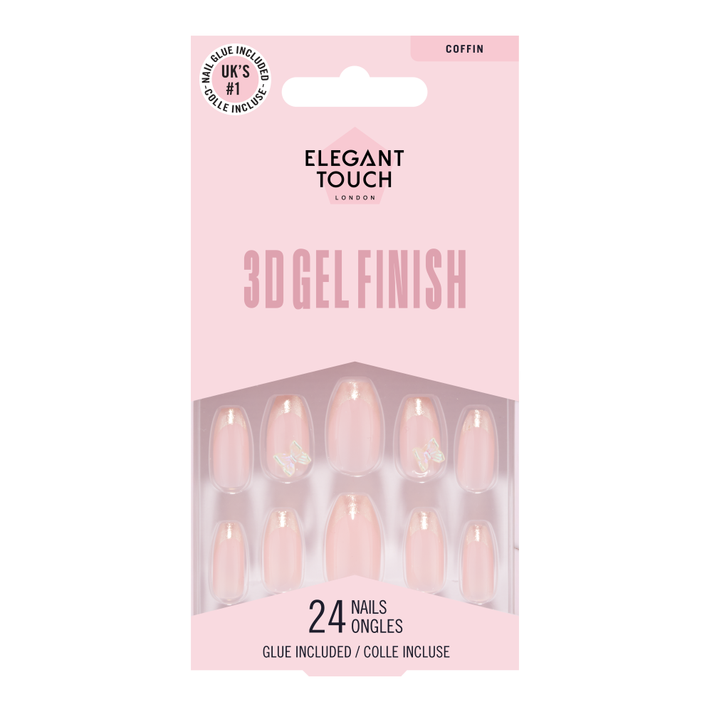 Don’t let this mani Flutterby you! Meet our Coffin shimmery gold French tip nail with a 3D butterfly gem, “Flutterby”. This stunning glitter set brings the delicate beauty of butterflies to life this summer.